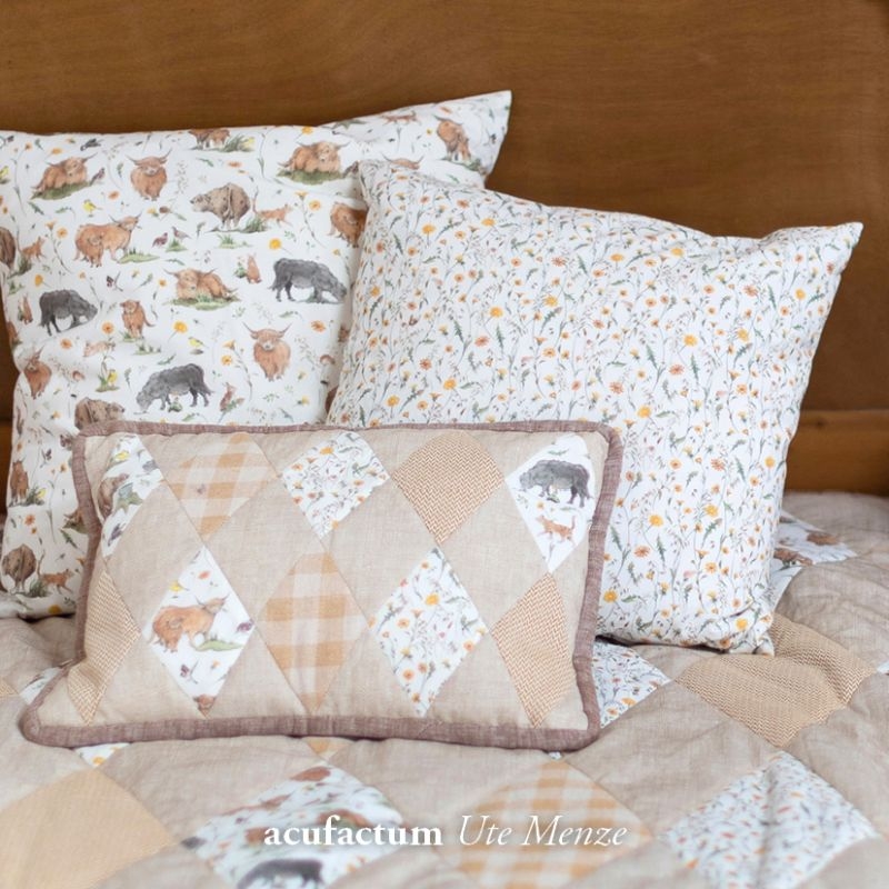 Einlaufen beim Waschen: | Die Baumwollstoffe können naturgemäß bis zu 5 % einlaufen. Deshalb empfiehlt Acufactum die Stoffe vor dem Vernähen (besonders in Kombination mit anderen Materialien) zu waschen. Im Trockner können die Stoffe zusätzlich einlaufen, ein hoher Schleudergang beansprucht den Stoff zusätzlich. |