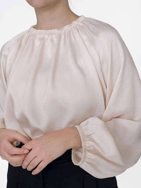 Eine voluminöse Bluse, am Rundhalsausschnitt mit Gummizug gerafft. Es hat bauschige Raglanärmel mit elastischen Bündchen.