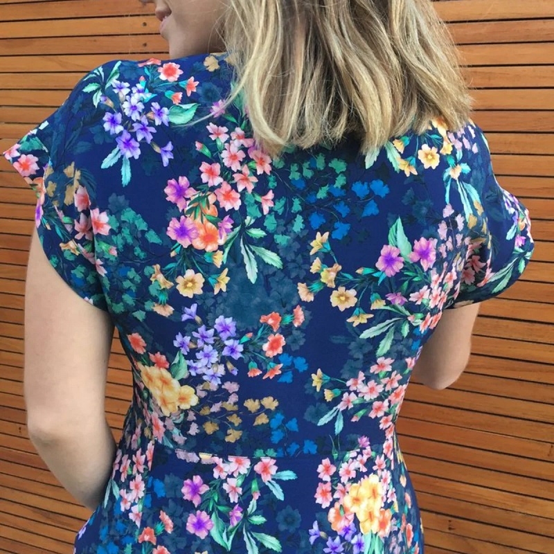 Das Lois Kleid ist von Vintage inspiriert und verfügt über ein Oberteil mit V-Ausschnitt und einen fließenden Rock in A-Linie, der in eine zeitlose Midi-Länge fällt. Zu den Abschlussmerkmalen gehören Armbänder mit Bündchen, ein Steppdetail am Halsausschnitt und an der Taille sowie ein unsichtbarer seitlicher Reißverschluss, der in einem Abnäher platziert ist.